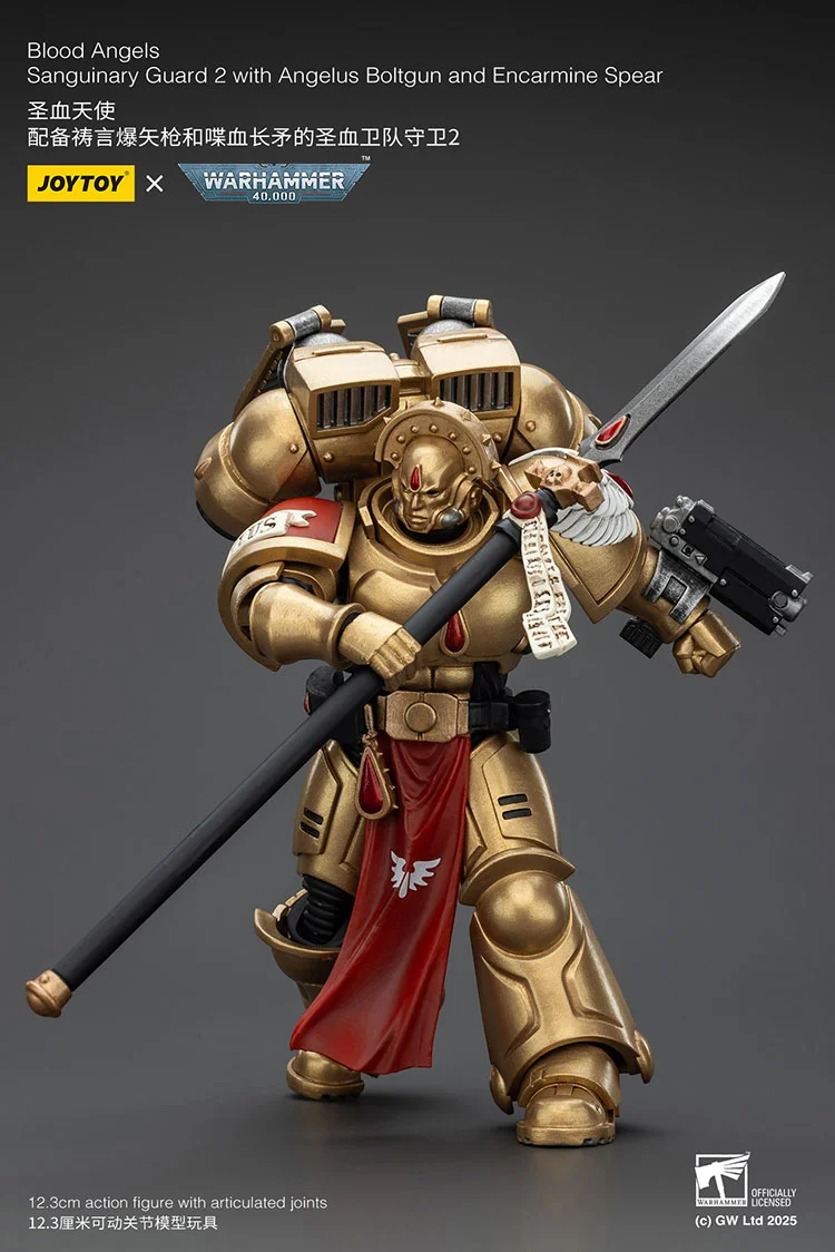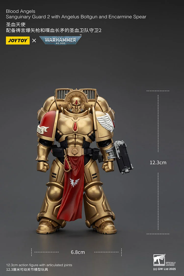 - En el sombrío futuro de Warhammer 40K, la Sanguinary Guard encarna el legado inmortal de Sanguinius. La figura Blood Angels Sanguinary Guard 2 de JoyToy, en escala 1/18 con 12,3 cm de altura, da vida a uno de los guerreros dorados más icónicos. Fabricada en ABS y PVC de alta calidad, une resistencia, detalle y un esculpido fiel al trasfondo.
