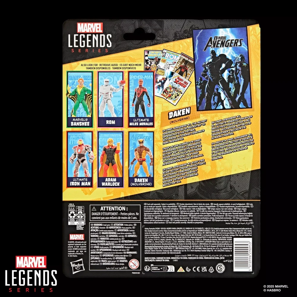 • El blister luce el logotipo de Dark Avengers sobre un fondo azul cargado de dramatismo, reforzando el tono sombrío que acompañó a esta alineación bajo las órdenes de Norman Osborn. La parte trasera presenta la wave completa, vinculada a personajes como Banshee, ROM, Ultimate Iron Man y Ultimate Miles Morales, invitando a completar una colección temática de la etapa. Con sus 15 cm, Daken encaja perfectamente en cualquier display Marvel Legends, ya sea formando parte de una vitrina mutante o ocupando su lugar dentro de los Vengadores Oscuros.