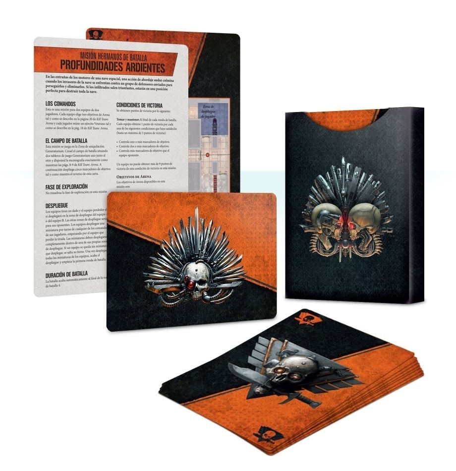 Hermanos de batalla: Introduce un formato cooperativo para jugar partidas competitivas de Kill team en equipo, en las que cada equipo de Hermanos de batalla consiste de dos jugadores cuyos comandos están enfrentados a los de sus oponentes para ver quién puede completar más objetivos. Incluye 4 misiones de Hermanos de batalla y 28 Tácticas de Hermanos de batalla.
