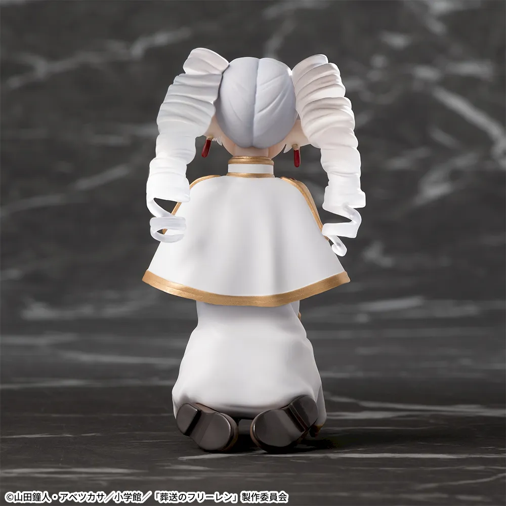 - Con una altura aproximada de 10 cm, la figura muestra a Frieren sentada en pose serena, diseñada para posarse en repisas, bordes o vitrinas gracias al formato característico de la línea PM Perching de SEGA. Su túnica blanca ribeteada en dorado contrasta con las franjas negras del uniforme interior. Además, las botas y la capa aportan volumen al conjunto.